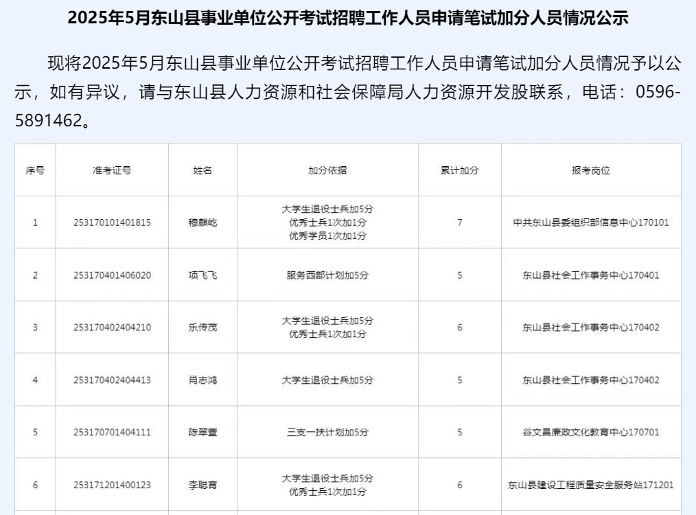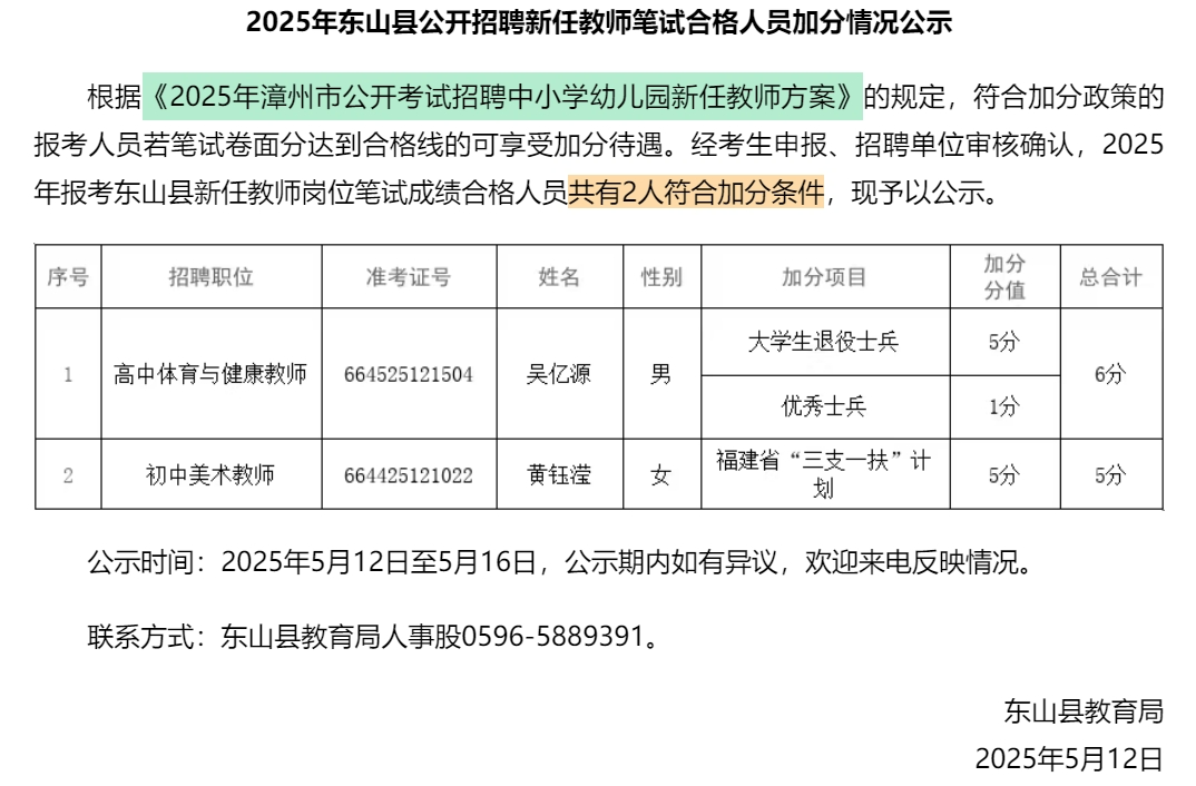 5月20日,漳州市东山县2025年事业单位公开招聘工作人员笔试成绩公布,公示名单中大学生退役士兵占比近半。此前,在2025年东山县新任教师招聘笔试加分公示中,集美大学退役士兵吴亿源凭借政策加分优势,以总分领先第二名1分的成绩入围专岗定向招录,并顺利进入政审环节。