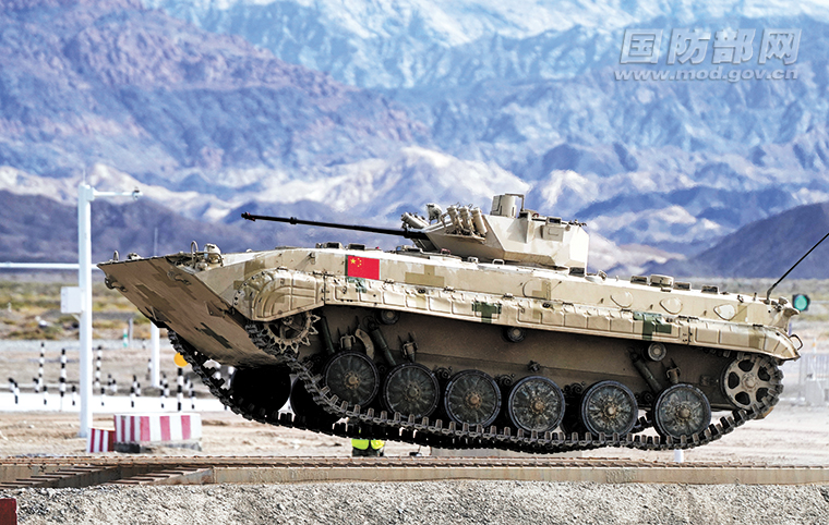 接力赛中,中国参赛队员驾驶步战车穿越障碍。张永进摄