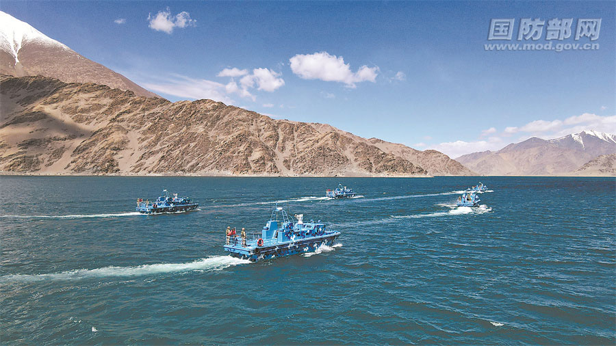 新疆军区某边防团巡逻艇中队官兵在班公湖上巡逻执勤。索延客摄