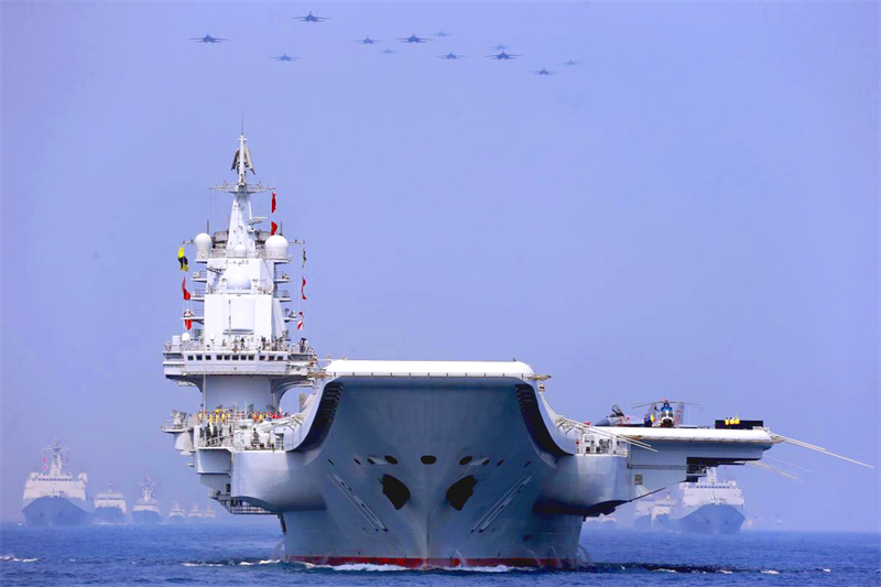 “在中国共产党坚强领导下,人民海军一路劈波斩浪,纵横万里海疆,勇闯远海大洋,大踏步赶上时代发展潮流,取得了举世瞩目的伟大成就。”