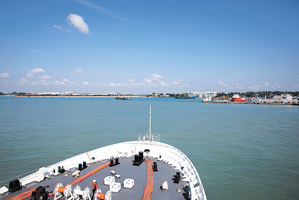 当地时间1月3日上午,中国海军和平方舟医院船向新加坡樟宜海军基地码头靠泊。刘志磊 摄