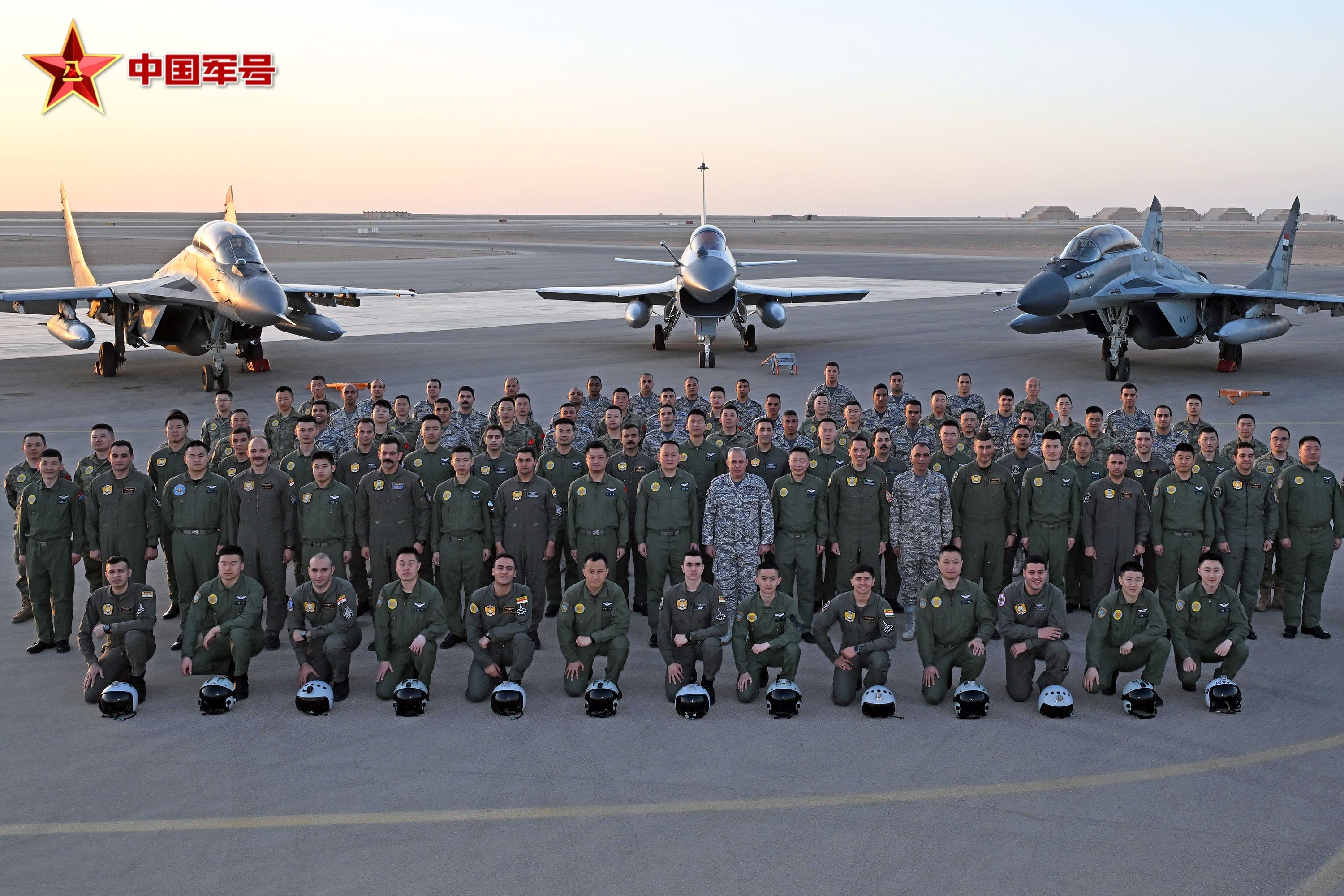 4月16日,埃及空军某基地,参加中埃“文明之鹰-2025”空军联合训练的部分官兵合影留念。
