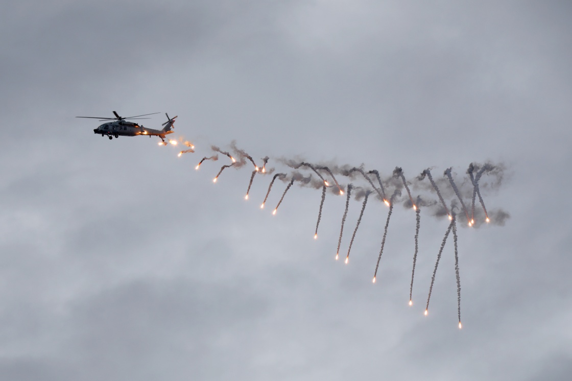 5月26日,中柬“金龙-2025”联演海空方向实兵演练在柬埔寨西哈努克港附近海空域举行,参演直升机发射热诱弹。新华社发(甘俊 摄)