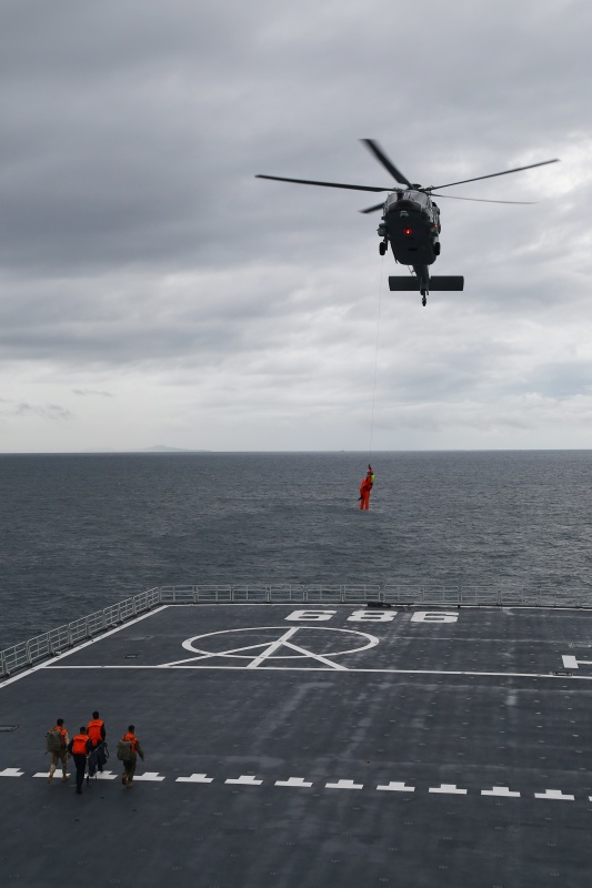 5月26日,中柬“金龙-2025”联演海空方向实兵演练在柬埔寨西哈努克港附近海空域举行,参演直升机将“伤员”转运至中国海军长白山舰。新华社发(甘俊 摄)