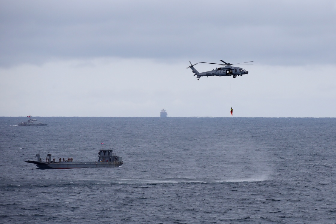 5月26日,中柬“金龙-2025”联演海空方向实兵演练在柬埔寨西哈努克港附近海空域举行,参演直升机搜救落水“伤员”。新华社发(甘俊 摄)