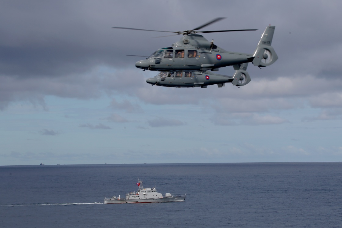 5月26日,中柬“金龙-2025”联演海空方向实兵演练在柬埔寨西哈努克港附近海空域举行,参演部队开展舰机协同训练。新华社发(张博明 摄)