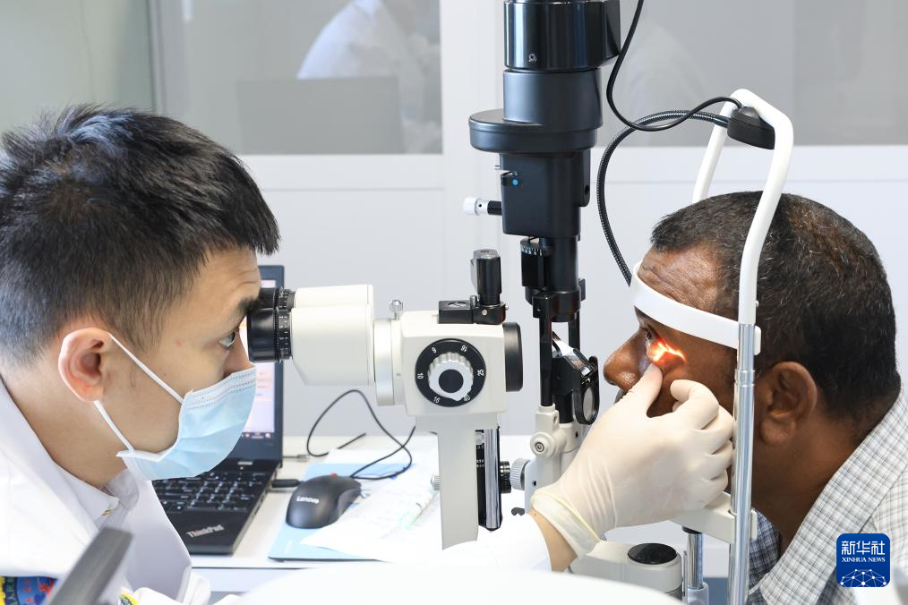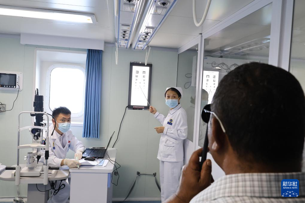 9月23日,中国海军“丝路方舟”号医院船医护人员在瑙鲁为当地民众进行眼科检查。新华社发(崔晓洋摄)