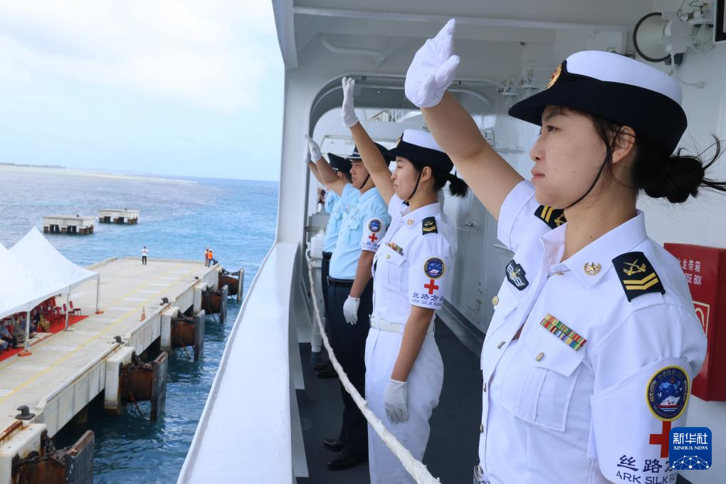 “丝路方舟”号医院船离开码头后与汤加海军举行了通信操演,随后双方舰艇鸣笛敬礼分航。
