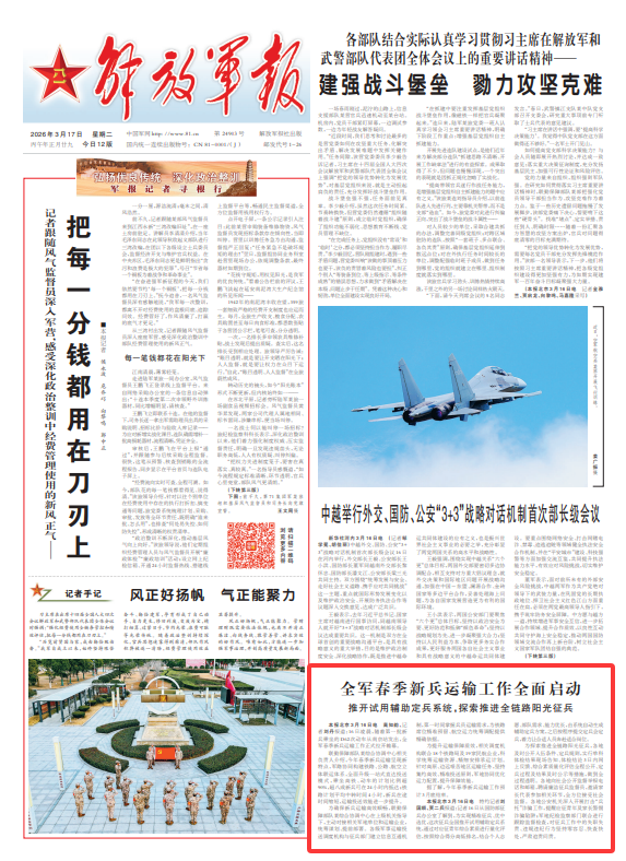 联勤保障部队某综合协调中心相关负责人介绍,今年春季新兵运输呈现新特点,军路协同构建铁路、公路、航空立体联运体系,全面升级一站式直达投送模式,乘坐高铁、动车的计划比例超90%,超八成新兵可在24小时内抵达;铁路计划平均中转时间4小时,新兵在途时间缩短,运输投送效能进一步提升。