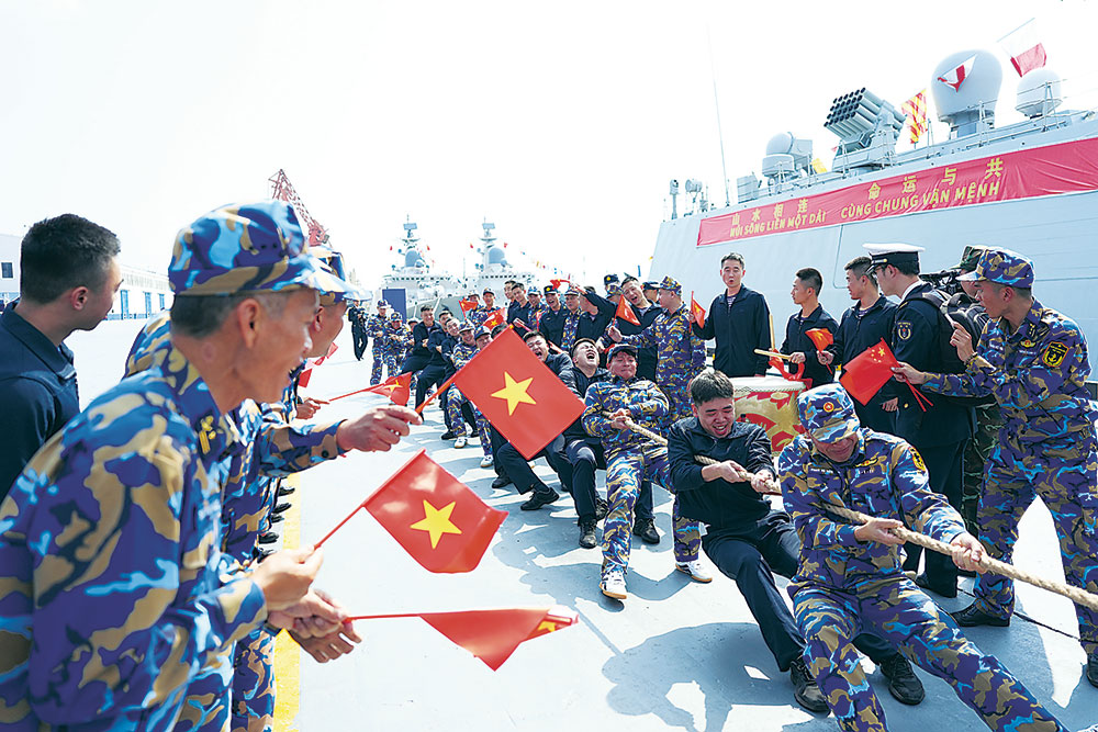 三月的广西防城港,海风轻柔,阳光澄澈。参加中越第十次边境国防友好交流活动海军港岸交流活动的两国海军舰艇悬挂满旗,静静停泊。