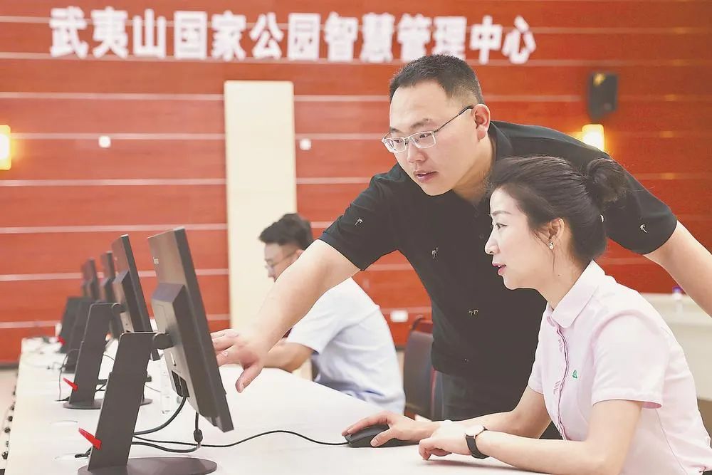 范志伟(中)在武夷山国家公园智慧管理中心工作。本报记者 林熙 摄
