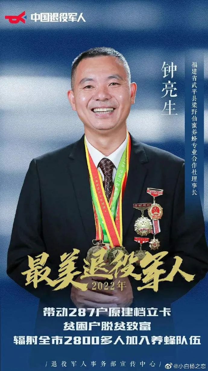 钟亮生现任武平县梁野仙蜜养蜂专业合作社党支部书记,福建省第十三届人大代表。退役后先后筹建了养蜂合作社、蜂业公司、养蜂协会,通过“合作社+公司+基地+农户”的模式在“甜蜜事业”上闯出了一片天地,自己也成为闽粤赣边闻名的“蜂王”;他犹如蜜蜂一样,热于奉献,倾心扶残助困,在全省首创“三三制”助残扶贫模式,帮助全县192名残疾人就业创业;他带领乡亲奋力摆脱贫困,采用激励帮扶机制带动287户建档立卡贫困户实现脱贫致富,并辐射带动全市2800多人加入养蜂队伍,使小小的蜜蜂产业成为武平的农业支柱产业之一,武平蜂蜜成为闽西八大鲜农产品之一。