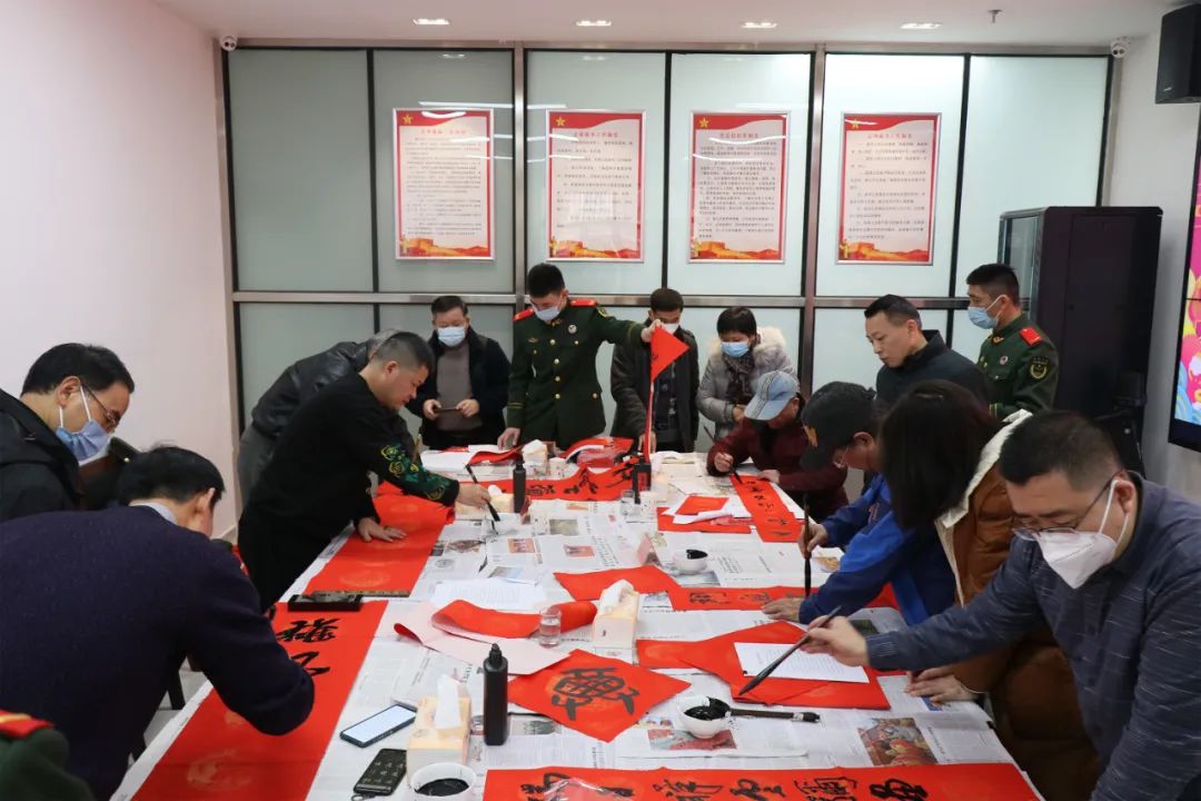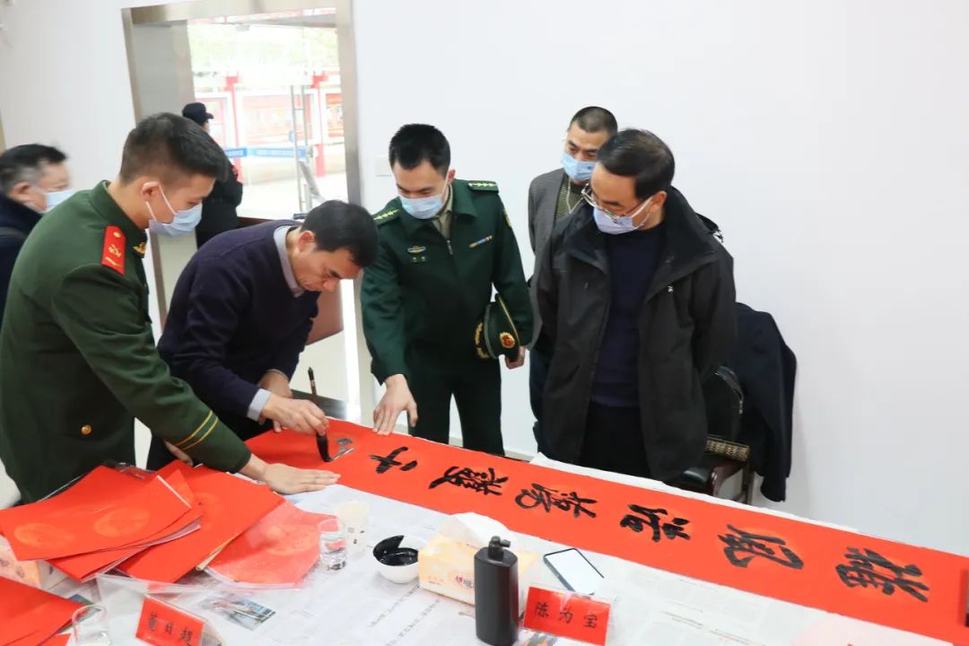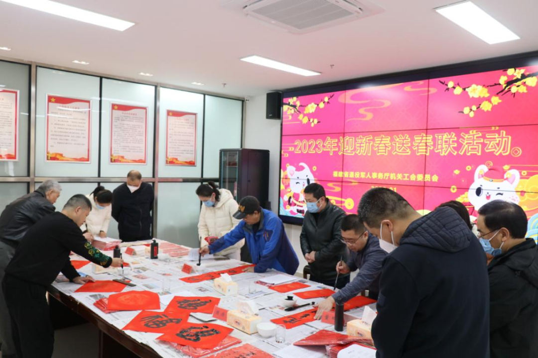 墨香飘万里,福兔迎新春。为进一步加强厅机关文化建设,传承弘扬中华优秀传统文化,营造祥和、欢乐、喜庆的节日氛围,1月17日下午,省退役军人厅开展“迎新春送春联”活动。邀请了省爱国拥军书画院卢明、王建忠、翁万康、陈为宝、周野、董日超等6位书法家现场挥毫,为部队官兵和厅机关干部职工送上新春的祝福和真挚的问候。厅党组成员、副厅长陈建辉,厅二级巡视员陈勇参加活动。