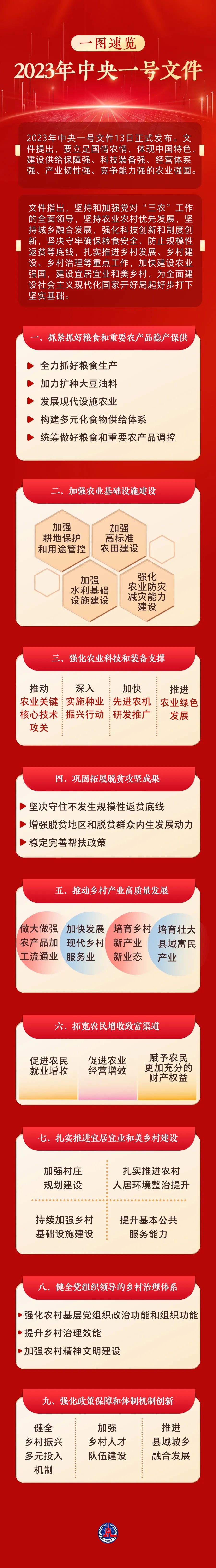 这份文件题为《中共中央国务院关于做好2023年全面推进乡村振兴重点工作的意见》,全文共九个部分,包括:抓紧抓好粮食和重要农产品稳产保供、加强农业基础设施建设、强化农业科技和装备支撑、巩固拓展脱贫攻坚成果、推动乡村产业高质量发展、拓宽农民增收致富渠道、扎实推进宜居宜业和美乡村建设、健全党组织领导的乡村治理体系、强化政策保障和体制机制创新。