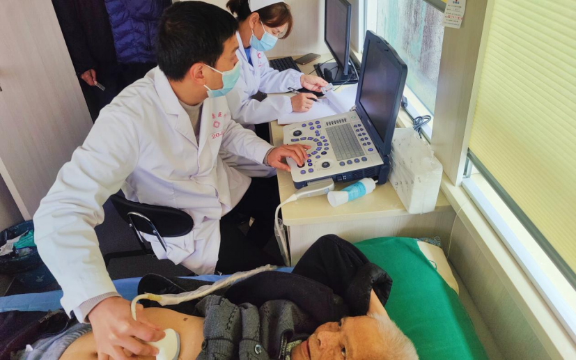 ↑联勤保障部队第九〇〇医院心内科林毅主任为优抚对象做检查