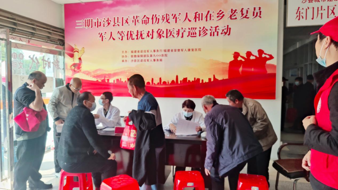 据了解,此次由福建省退役军人事务厅组织福建省荣誉军人康复医院、中国人民解放军联勤保障部队第九〇〇医院、三明市沙县区退役军人事务局等单位开展的“2023年全省残疾军人和在乡老复员军人等优抚对象医疗巡诊活动”走进三明沙县区,为当地的残疾军人、在乡老复员军人和烈属、功臣模范等优抚对象开展为期五天(4月10日-4月14日)的免费诊疗服务。活动前两日累计服务优抚对象近百人,接下来,医疗巡诊队将前往高桥镇、夏茂镇、高砂镇等地,继续为残疾军人和在乡老复员军人、烈属、功臣模范等优抚对象进行免费诊疗。