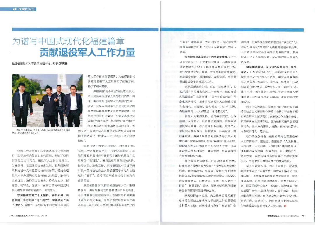 近日,2023年《中国退役军人》第五期杂志发表福建省退役军人厅党组书记、厅长罗庆春署名文章《为谱写中国式现代化福建篇章贡献退役军人工作力量》,现予全文转发。