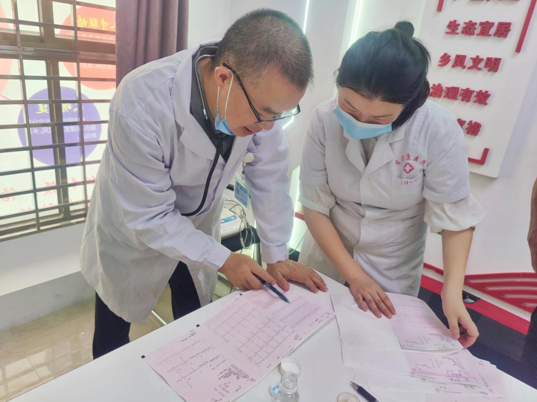 ▲联勤保障部队第九〇〇医院心内科喻云强主任正在为优抚对象查看心电图报告单