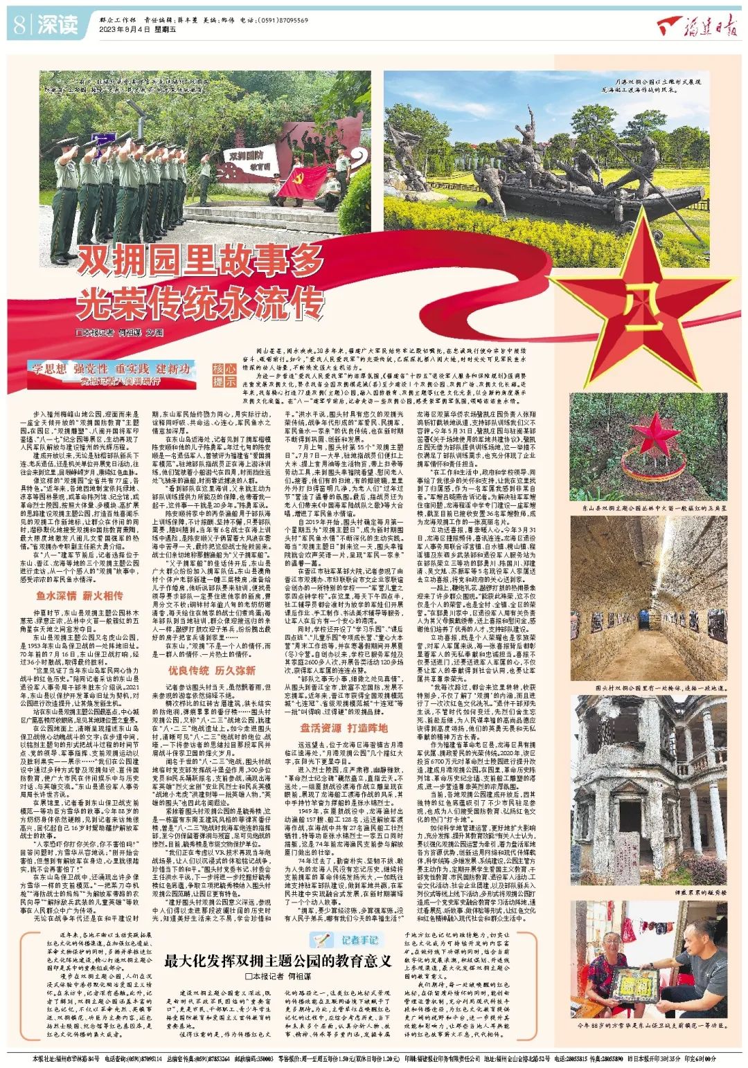 为进一步营造“爱我人民爱我军”的浓厚氛围,《福建省“十四五”退役军人服务和保障规划》强调要注重发展双拥文化,要求我省全国双拥模范城(县)至少建设1个双拥公园、双拥广场、双拥文化长廊。近年来,我省精心打造77座双拥(主题)公园,融入国防教育、双拥主题等红色文化元素,以全新的角度展示双拥文化底蕴。在“八一”建军节前后,走访一些双拥公园,感受崇军拥军氛围,领略浓浓鱼水情。