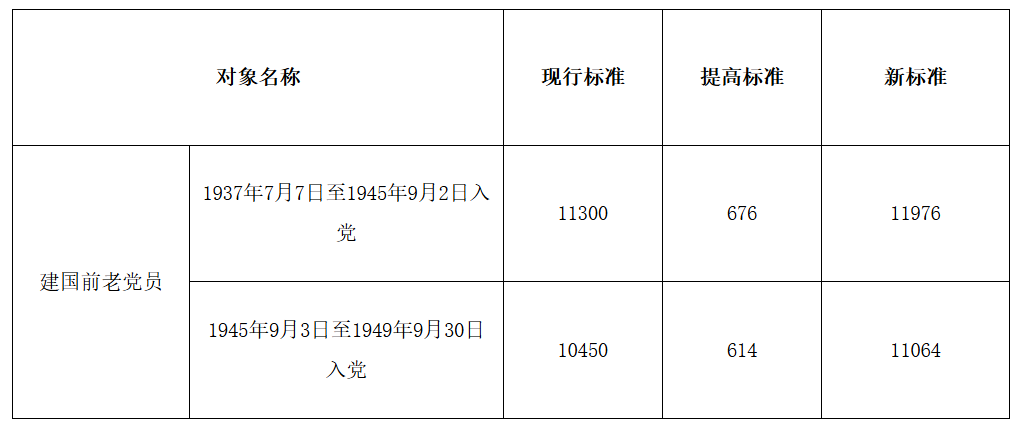 六、提高建国前加入中国共产党的农村老党员和未享受离退休待遇的城镇老党员的生活补贴标准,调整后的补贴标准为:1937年7月7日至1945年9月2日入党的,提至每人每年11976元;1945年9月3日至1949年9月30日入党的,提至每人每年11064元。已享受优抚对象抚恤补助的老党员,不执行上述补贴标准,仍按每人每年600元标准发放生活补助。调标所需资金扣除中央负担的25%外,其余部分继续按照《关于做好老党员生活补贴发放工作的通知》(闽委组通〔2006〕70号)确定的分担比例,由省管党费承担60%,省财政承担40%。