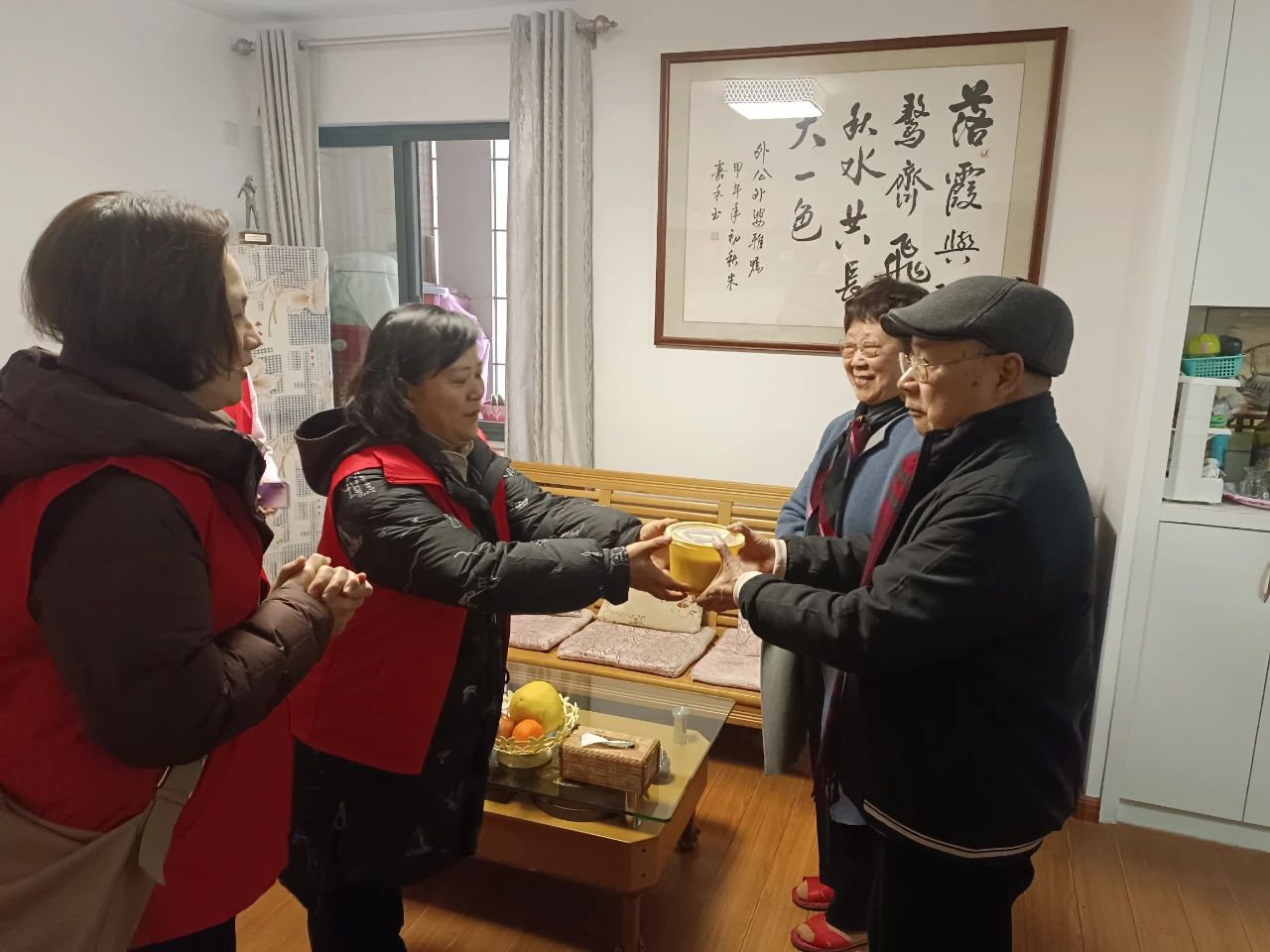 随后,大家前往社区退役老兵——80岁高龄的袁启雄、薛淑贞夫妇家中,详细询问他们的身体状况和生活情况,倾听他们的军旅故事,感谢他们为国家和人民做出的贡献,并将一碗饱含深情的拗九粥送到他们手中。
