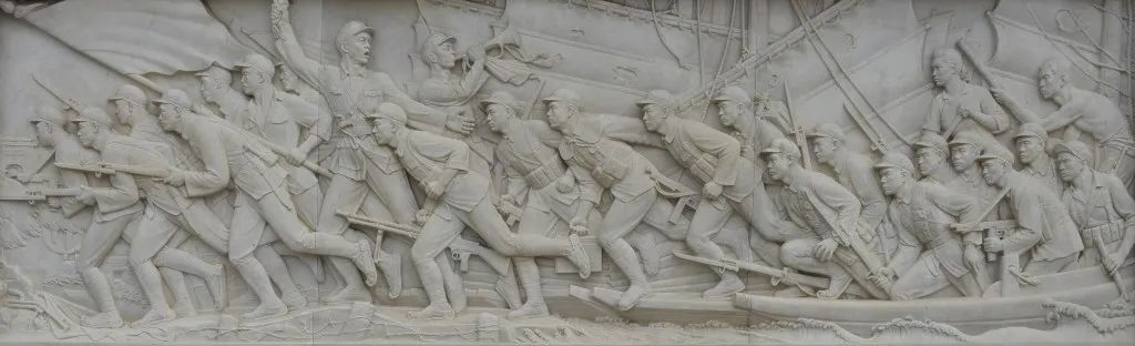 与碑心石开采运输同步进行的是汉白玉开采加工,以及浮雕的设计工作。在人民英雄纪念碑10块汉白玉浮雕的题材选取过程中,遵照选取最能代表人民革命的历史事件,且能集中展现纪念碑主题思想的原则,进行了精挑细选和反复研究。按照历史时间顺序,最终确定了我们今天看到的8个历史题材10幅浮雕,分别为:虎门销烟、金田起义、武昌起义、五四运动、五卅运动、南昌起义、抗日游击战争、胜利渡长江解放全中国,完整生动地反映了从鸦片战争到解放战争中国人民反帝反封建的革命历史。其中,“胜利渡长江解放全中国”主题浮雕,以及两侧主题分别为“支援前线”和“欢迎人民解放军”的装饰性浮雕,位于人民英雄纪念碑正面,突出歌颂中国共产党领导的新民主主义革命取得的伟大胜利。