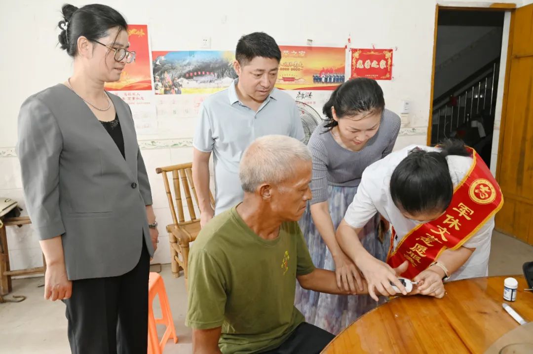 获悉退役军人吴乾财刚从田间地里回家,来不及到村部就诊,服务队特别安排专家小组,携带诊疗设备上门为吴乾财诊疗。省、市、县退役军人事务部门带着慰问品也一并来到退役军人家庭。专家们详细询问病史、仔细检查身体,将健康服务和组织的温暖直接送达家中,令吴乾财及其家人感动不已,连声道谢。