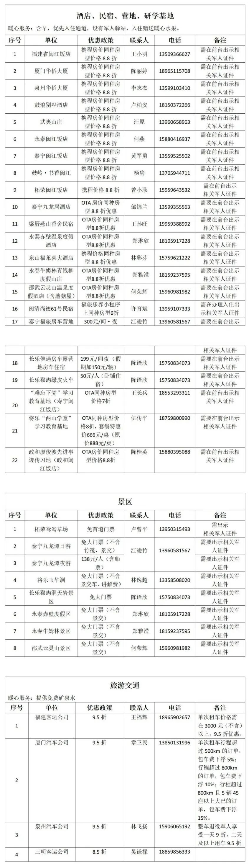 7月28日,省退役军人事务厅联合福建省旅游发展集团正式启动“军民鱼水情、福旅惠军行”拥军优属服务工作,并举行了拥军优属项目发布会。这是继去年4月全省推出近300家A级景区面向全国持优待证者减免门票之后,又上新一批涉及景区、酒店、交通等领域的优待项目。省退役军人事务厅党组成员、副厅长蔡静南,省旅游发展集团党委委员、总会计师余运庄,党委委员、副总经理肖绍平出席发布会。