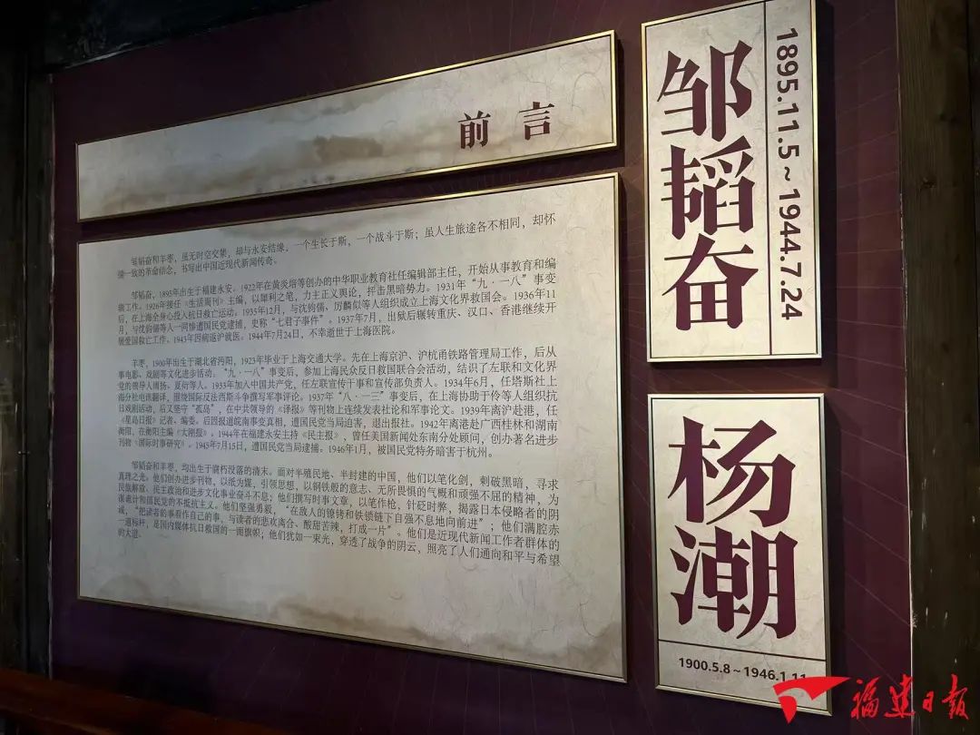 走进邹韬奋、羊枣事迹主题展,大量的珍贵历史照片再现邹韬奋和羊枣创办进步刊物,以笔作枪、引领思想,为民族解放、民主政治和进步文化事业奋斗不息的光辉事迹。