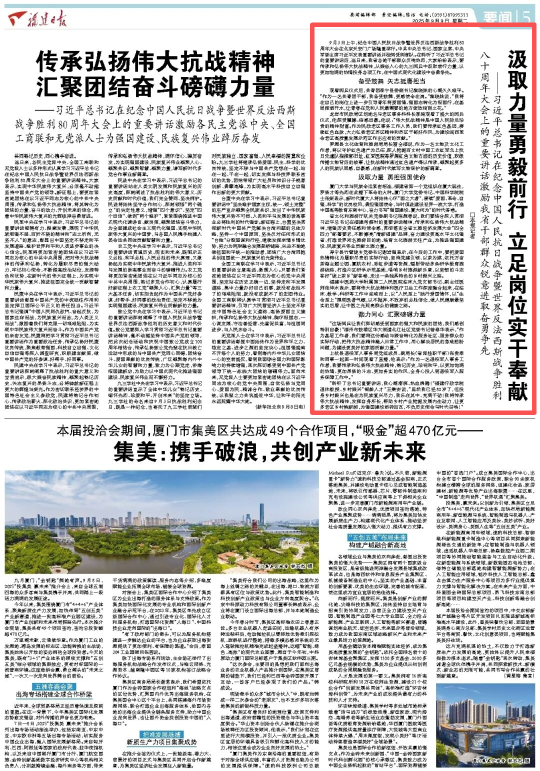 9月3日上午,纪念中国人民抗日战争暨世界反法西斯战争胜利80周年大会在北京天安门广场隆重举行。中共中央总书记、国家主席、中央军委主席习近平发表重要讲话并检阅受阅部队。在聆听了习近平总书记的重要讲话后,连日来,我省各地干部群众反响热烈,大家纷纷表示,要传承和弘扬伟大抗战精神,从振奋人心的九三阅兵中汲取前行力量,以更加饱满的热情投身各项工作,在中国式现代化建设中奋勇争先。