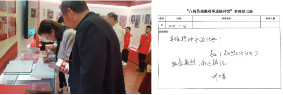 在展陈馆里,4位省烈保中心红领巾英烈讲解员分别宣讲了林祥谦、蔡威、吴石、陈祥榕等具有代表性的福建籍英烈事迹。吴红一行专注聆听,并与红领巾英烈讲解员们亲切互动交流,表示要把小讲解员们声情并茂的讲述和自信从容的风采拍下来,带回去给自己的孙子学习。当讲到吴石烈士事迹时,吴红动容地说道,“感谢你们一直致力于把爷爷的精神告诉大家”。她在留言簿上写下,“英雄精神永远传承”,并鼓励红领巾讲解员们继续传承弘扬红色基因,用清脆的童声传递力量,让八闽英烈先辈们的事迹“活”起来。