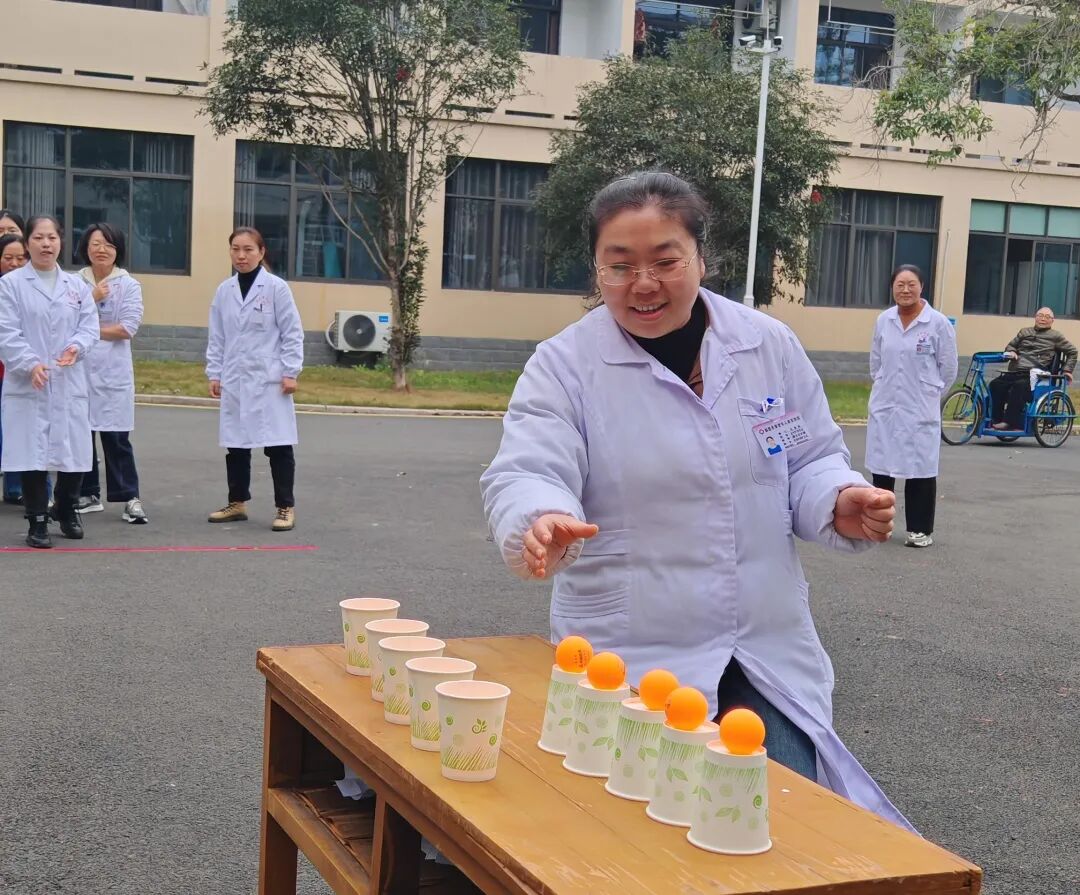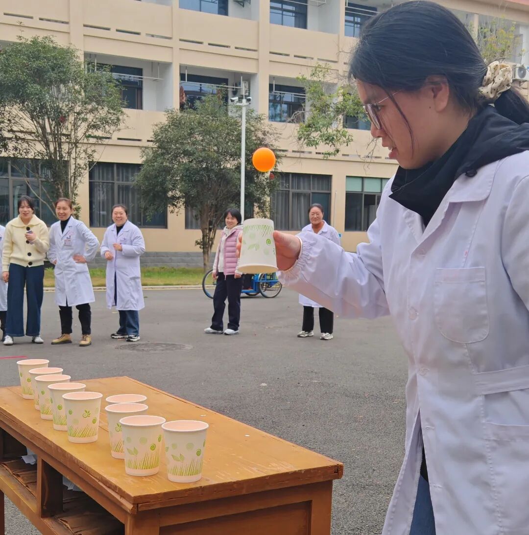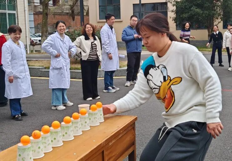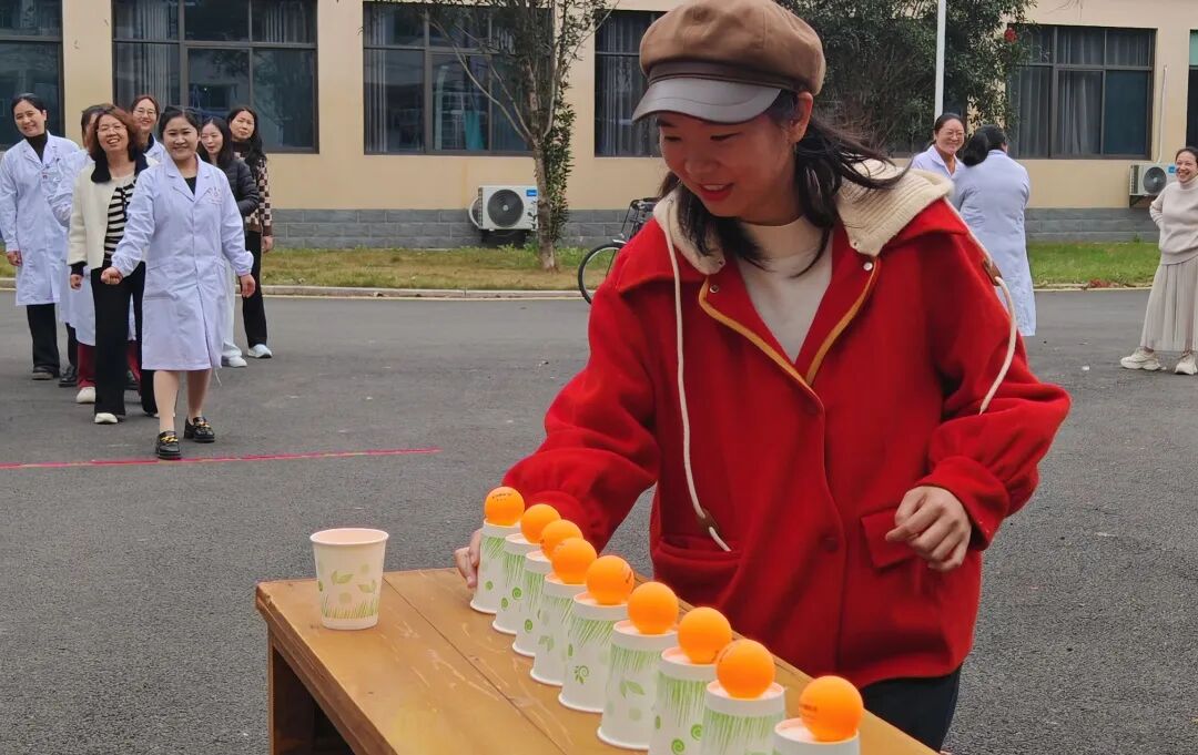 “纸杯接球”更是将活动推向高潮。选手们需要用纸杯将乒乓球抛起并稳稳接住,既考验手眼协调,更考验心理素质。一次次的尝试、一次次的坚持,展现了荣军医院女职工们坚韧不拔、勇于挑战的优良品质。场边啦啦队的加油呐喊声,更让整个赛场涌动着浓浓的团结暖意。