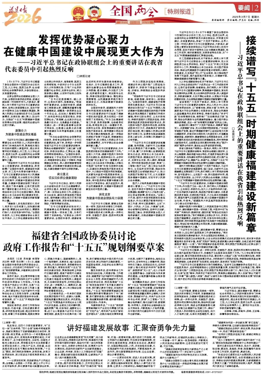 习近平总书记3月6日下午看望了参加全国政协十四届四次会议的农工党、九三学社、医药卫生界、社会福利和社会保障界委员并参加联组会,听取意见和建议,发表重要讲话。我省广大党员干部群众、各界人士第一时间认真学习总书记的重要讲话,大家表示,新征程上要更加紧密团结在以习近平同志为核心的党中央周围,坚定不移走中国特色卫生与健康发展道路,结合工作实际,做好统筹规划,发挥我省特色优势,为“十五五”时期健康福建建设汇聚强劲动能。
