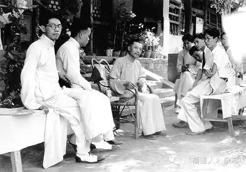 王冷斋(左三)向记者介绍日军挑起卢沟桥事变的过程