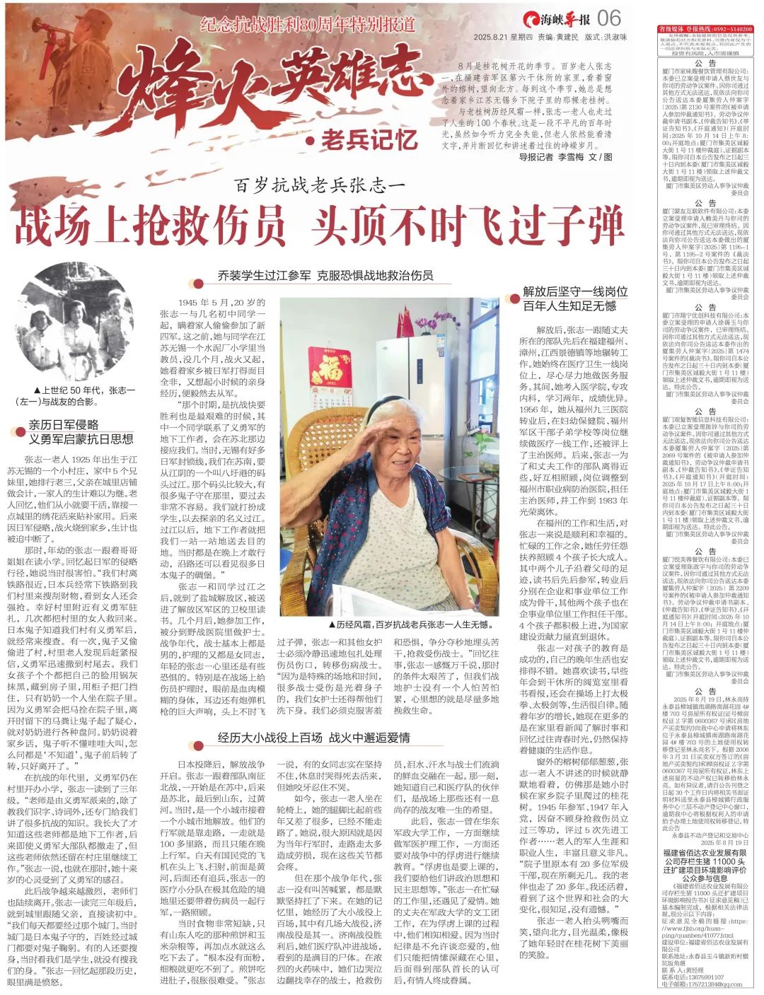 编者按:为纪念中国人民抗日战争暨世界反法西斯战争胜利80周年,深入挖掘抗战老兵事迹,传承红色基因,省退役军人事务厅联合各地市退役军人事务部门开展走进抗战老兵家庭,重温抗战历史系列活动。厅官网官微开辟“致敬抗战老兵”专栏对此进行系列宣传,今日推出《百岁抗战老兵张志一:战场上抢救伤员头顶不时飞过子弹》的故事。
