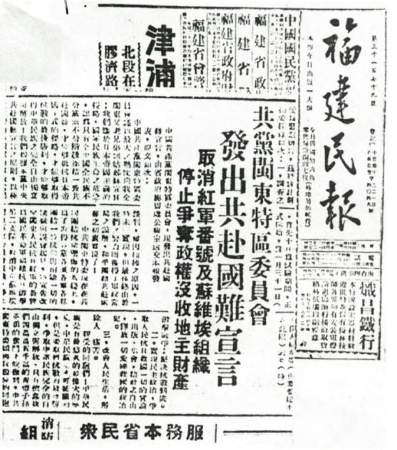 1937年12月,叶飞赴福州与国民党当局进行第四次谈判,双方达成协议。图为福建民报发表的《共赴国难宣言》