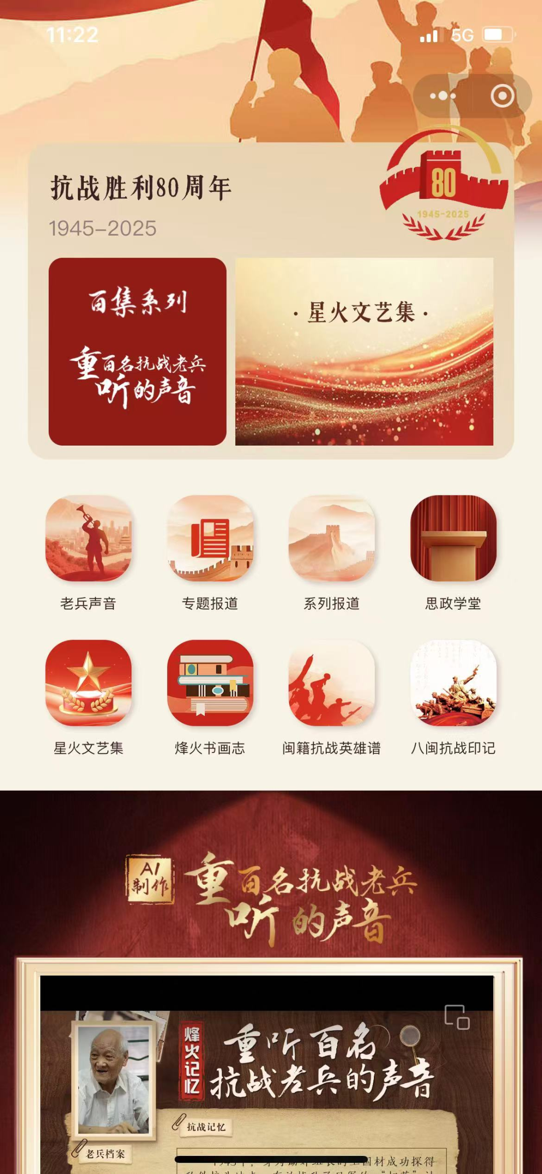 平台以数字化形式系统整合并呈现我省抗战历史珍贵资源,以声音、图像、文字与书画等载体,打造可感知、可触摸、可传承的抗战记忆数字空间,通过系统构以“重听百名抗战老兵的声音”“闽籍抗战英雄谱”“八闽抗战印记”“烽火书画志”等为核心的立体化内容矩阵,生动再现福建军民在抗战岁月中的英勇事迹与不朽贡献,为广大用户打造了一个可随时随地访问、具有深刻教育意义的“掌上抗战博物馆”。