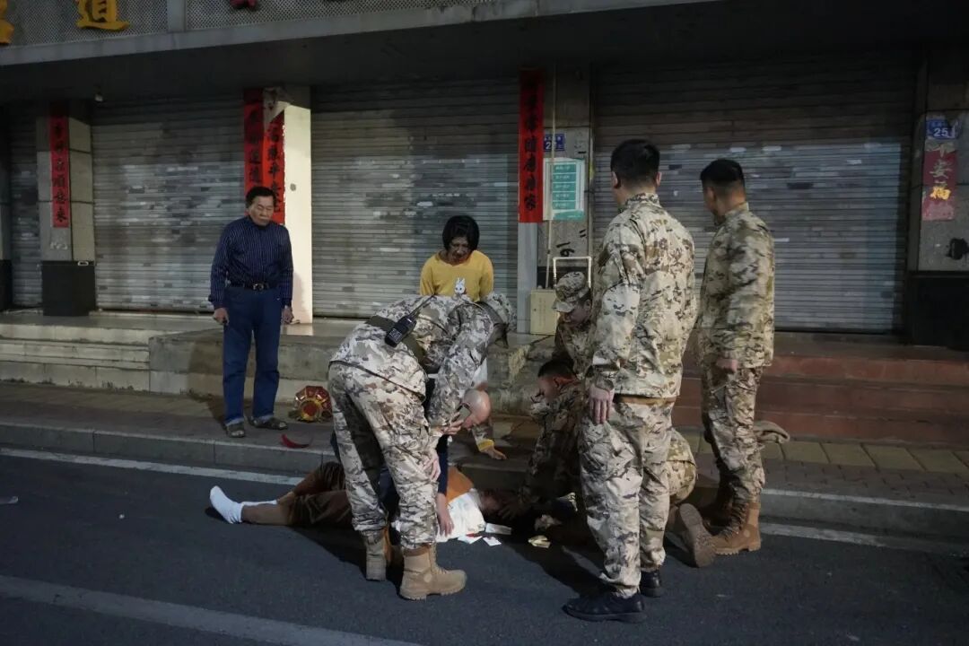 当晚,营区外传来异响。中队长田琨立即前往查看,发现一名女子倒在路中,意识不清,嘴角有血迹,呼吸急促。他随即拨打急救电话和报警电话,并向上级报告情况。