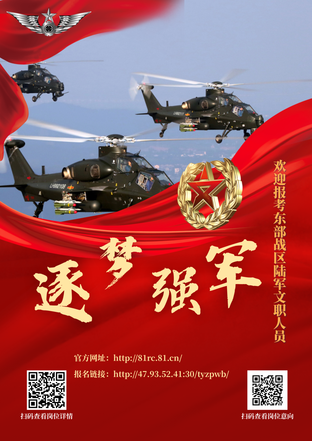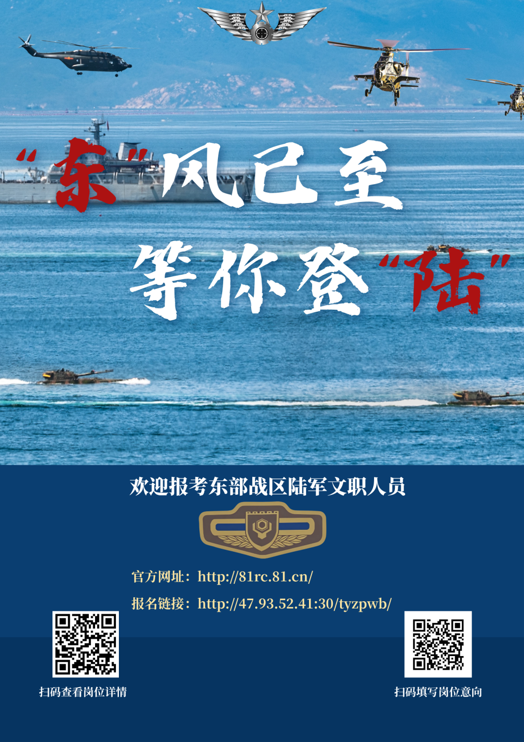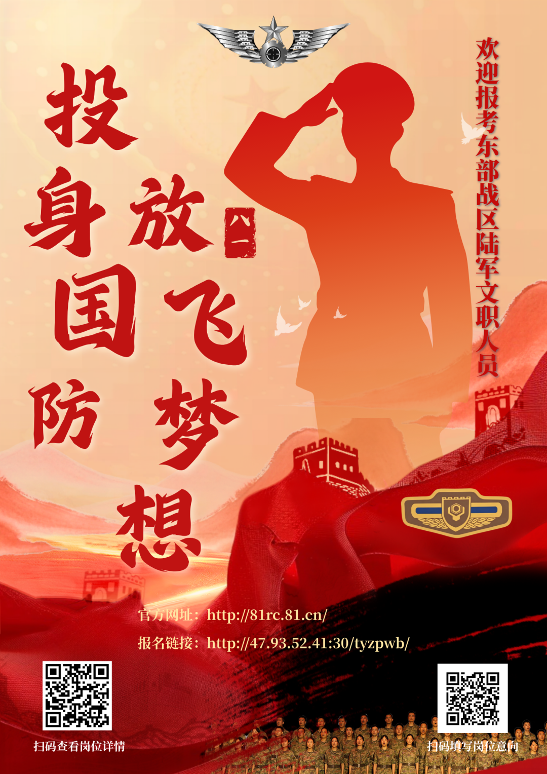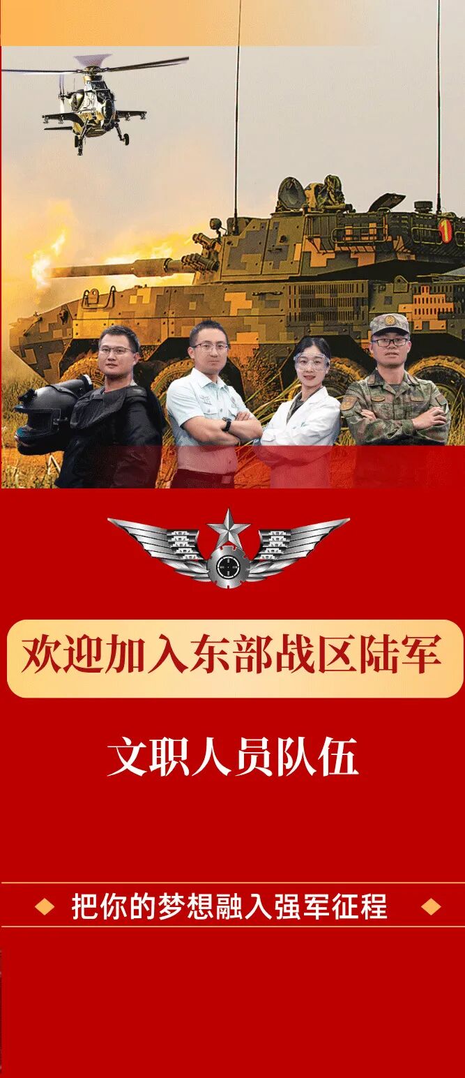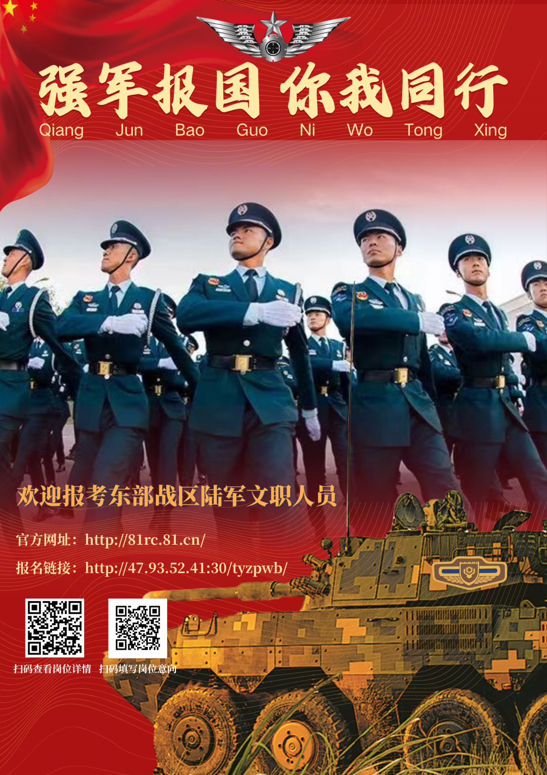 广大有志青年们,东部战区陆军文职人员队伍欢迎你的加入!(报名入口:http://47.93.52.41:30/tyzpwb/)