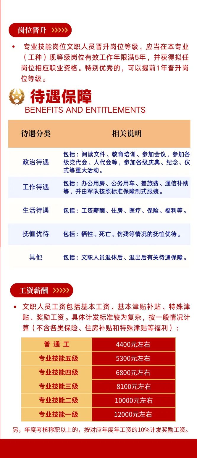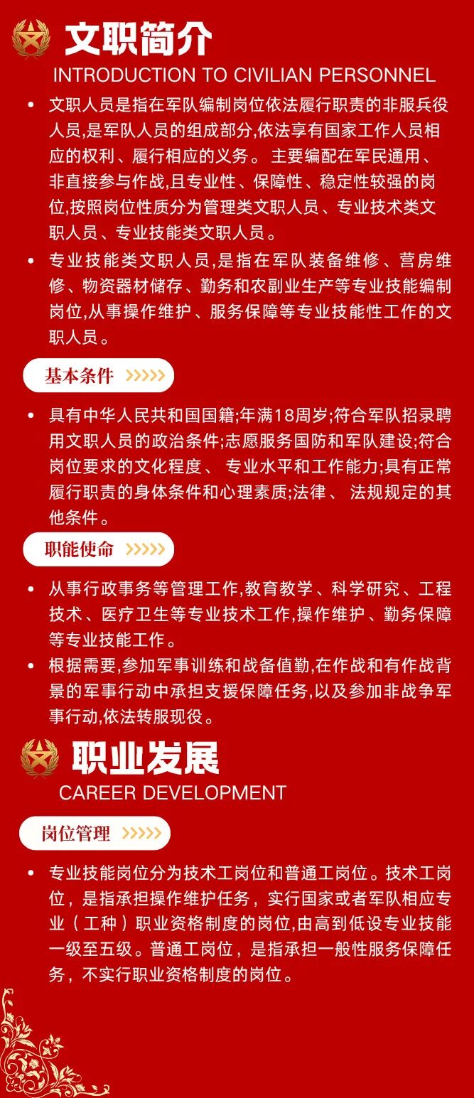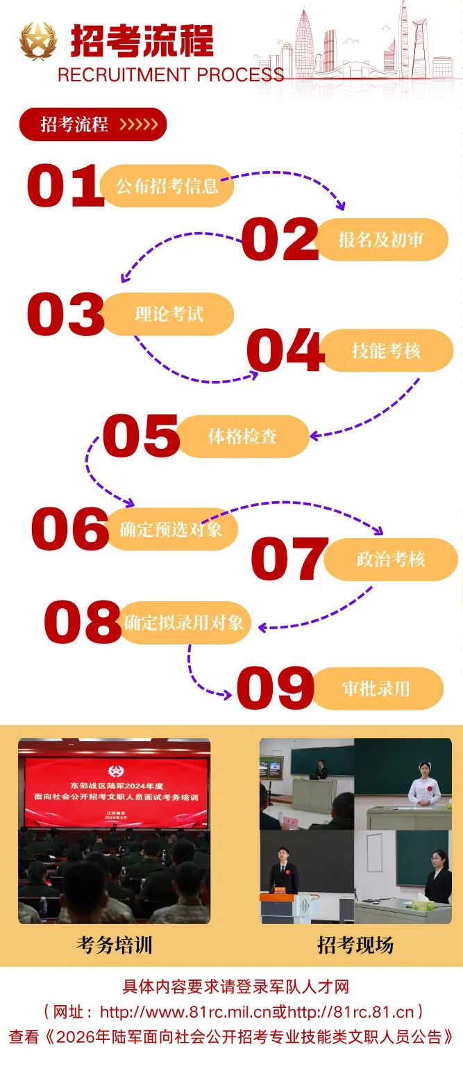 根据陆军统一部署安排,2026年专业技能类文职人员招考工作已正式展开,报名时间为:4月16日8:00至4月25日18:00。相关条件和岗位计划发布于军队人才网(网址:http://81rc.81.cn)。有意报名的考生,可以登录军队人才网查看《2026年陆军面向社会公开招考专业技能类文职人员公告》,了解更多岗位数量、资格条件、报名方式等具体信息,有其他疑问的,还可通过岗位计划上预留的电话向用人单位咨询。