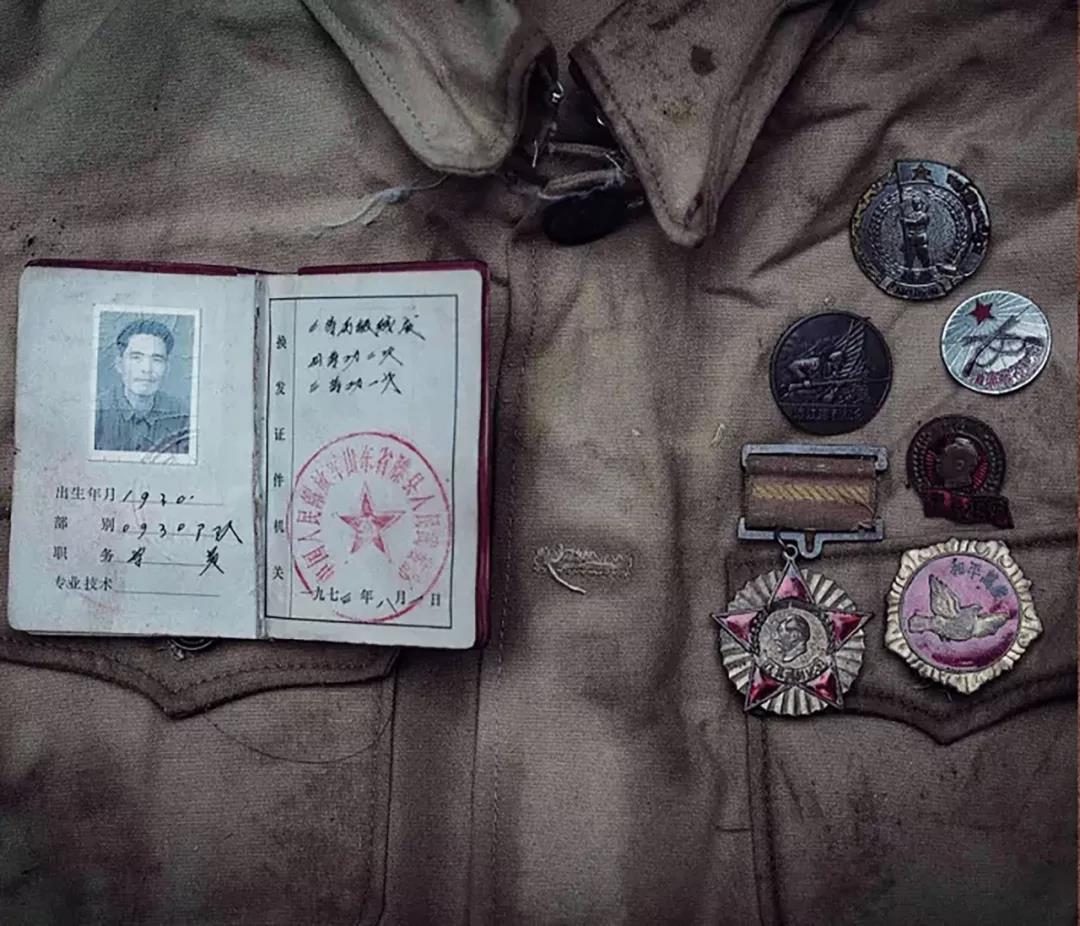 “我身边的英烈”主题征集活动获奖摄影作品,记录了山东枣庄革命老区参战老兵的证件和奖章。