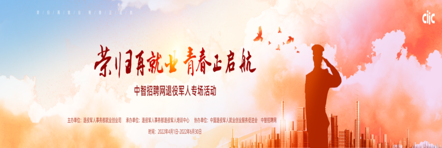 运营期间全国退役军人就业创业信息系统将与央企招聘平台中智招聘网联合举办“荣归再就业 青春正起航”专场活动(活动时间:2022年4月1日——6月30日)。