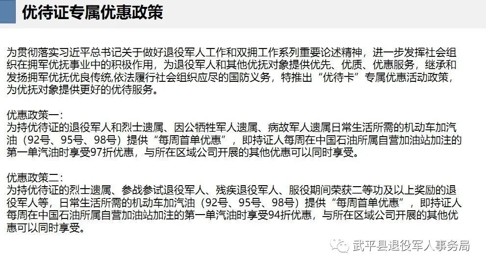 凭优待证本人在中油好客e站APP优待证专区申请办理后,由退役军人事务部审核通过后方可生效,生效后可在全国任意一家中石油进行加油消费享受9.7折或9.4折优惠;用户可到中国石油武平区域加油站进行办理。