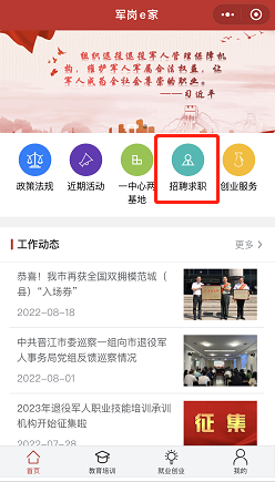 退役军人或用人单位可通过搜索微信小程序“军岗e家”登录平台,即可了解有关退役军人就业创业相关政策、活动、信息等。