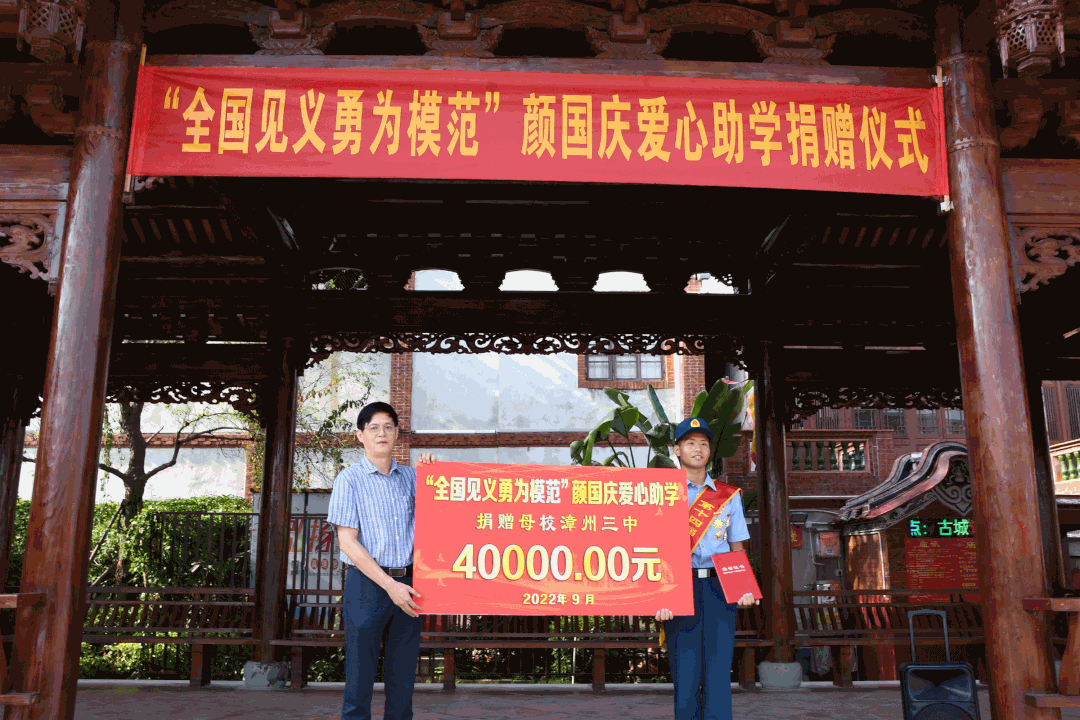 近日,全国见义勇为模范、东部战区空军某场站场务连班长颜国庆回到家乡漳州,将获得的10万元奖金全部回馈社会。其中9万元捐赠母校漳州三中、漳州五中、漳州市语堂小学,1万元捐赠给四川甘孜州红十字会,用以资助所在地的在校贫困生。漳州市退役军人事务局、芗城区人武部、漳州市烈士纪念设施保护中心、漳州三中、漳州五中党员干部、师生代表参加捐赠仪式。