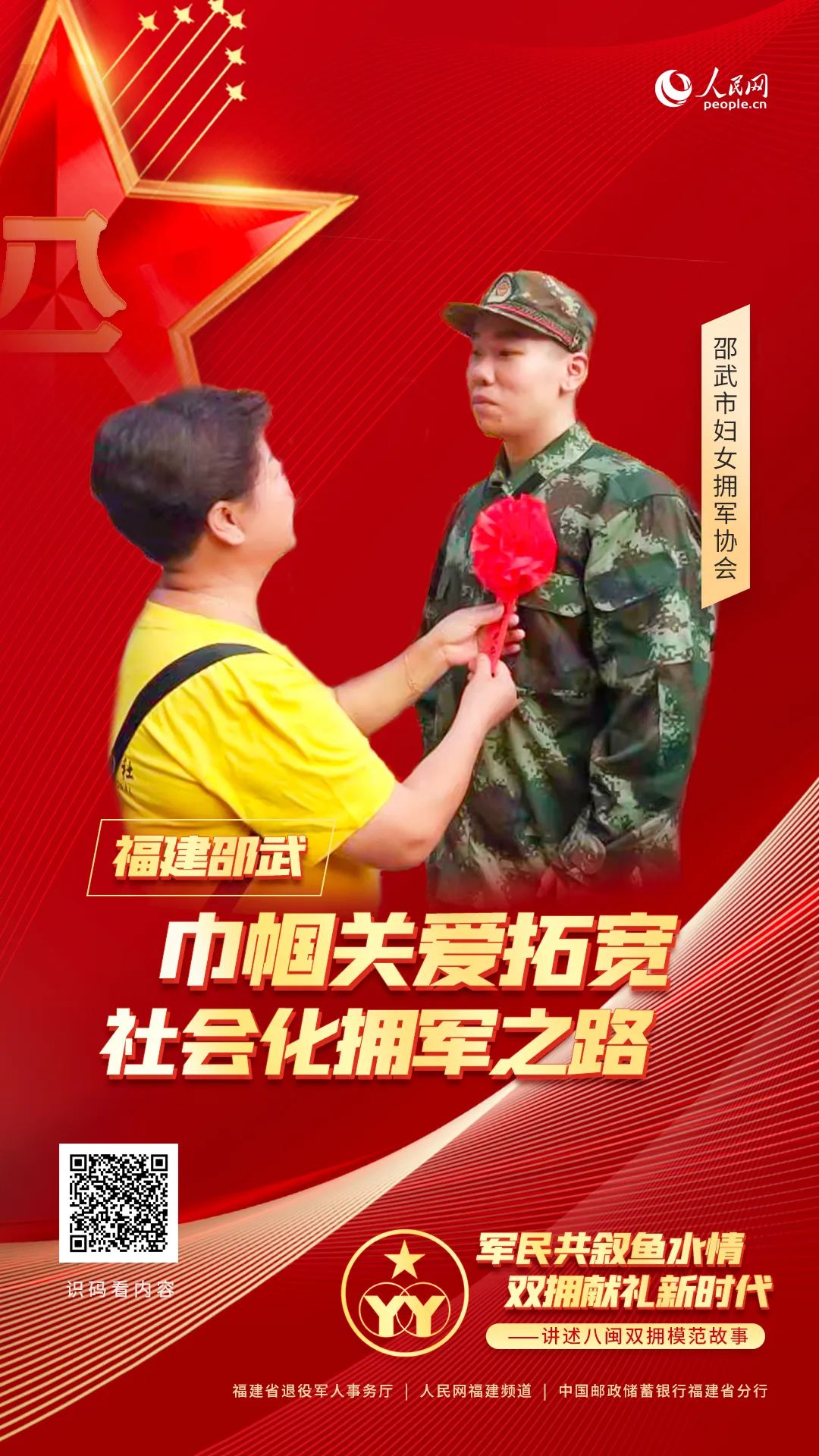 “军爱民、民拥军,军民鱼水一家亲。”福建,是全国唯一所有设区市连续五届获评双拥模范城(县)的省份,一个个军爱民、民拥军的生动故事在八闽大地不断涌现。为唱响闽山闽水间的“爱我人民爱我军”军民情主旋律,福建省退役军人事务厅联合人民网福建频道、中国邮政储蓄银行福建省分行共同推出“军民共叙鱼水情双拥献礼新时代”主题宣传活动,从“新时代八闽双拥故事”看福建如何续写新征程上的双拥新篇章。