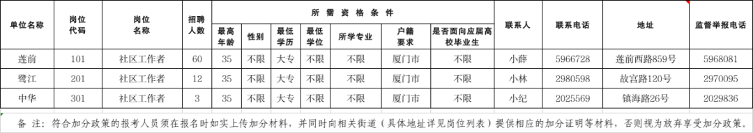 社会工作职业水平持证人员、高校“社会工作”专业毕业生、优秀共产党员、小区党支部书记、退役军人、“见义勇为”持证人员、社会组织负责人、网格员服务满1年以上(考生本人或直系三代亲属),在参加社区专职工作者招聘时,同等条件下优先聘用。