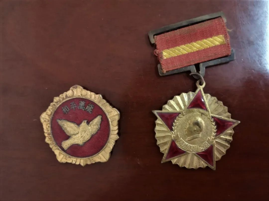 左为1953年10月25日中国人民赴朝慰问团赠给志愿军的纪念章;右为1951年中国人民政治协商会议全国委员会颁发的抗美援朝纪念章