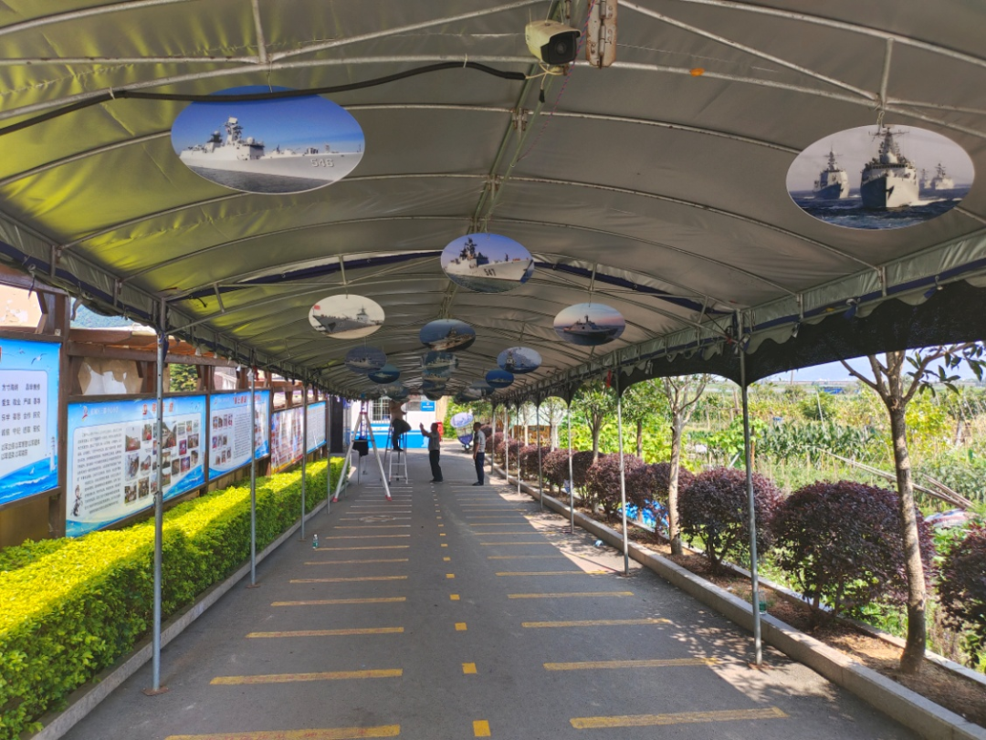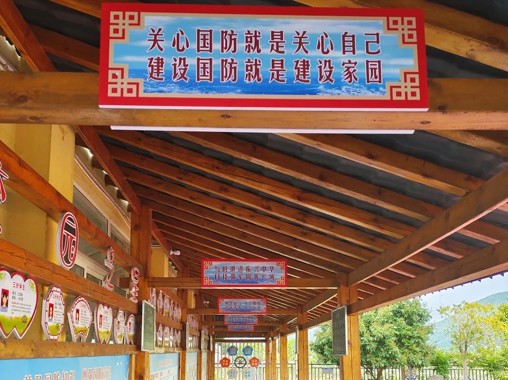充满海军元素的国防知识的图片展示,教学楼和礼堂悬挂十大英模先进事迹等宣传画框以及军事文化长廊添置双拥共建与国防教育的宣传标语。