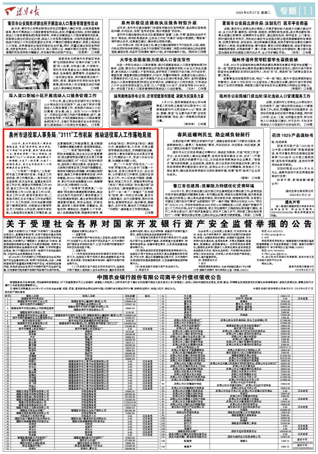 2023年,泉州市退役军人事务局围绕省委、市委“深学争优、敢为争先、实干争效”行动部署,秉承“要做就做一流、要争就争第一”的工作理念,创新推行“3111”工作机制,推动解决了一批难题、办成了一批实事、打造了一批特色亮点,助力全市退役军人工作继续走在全省前列。
